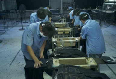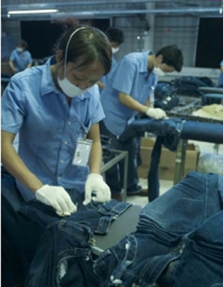 a) 在洗水前,通過使用砂輪滾動摩擦而使布面染料褪色,手擦的地方通常是脾位和臀位,人為的機械褪色,讓牛褲在洗水后顯得自然地懷舊和泛白